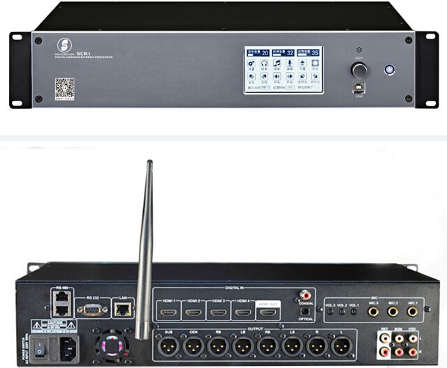 ▼音频处理采用双DSP芯片设计,解码芯片采用专业级ADI第四代DSP芯片,400MHz主频,96KHz采样频率32-bit浮点运算,KTV处理采用德州TI公司TMS320VC67系列DSP芯片处理,功能强大.